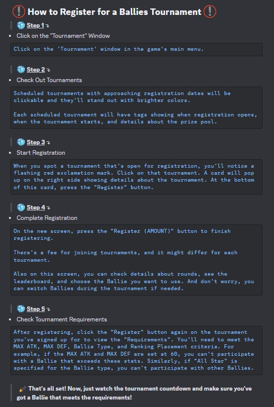 Each tournament type comes with its own set of entry criteria and formats, covering aspects like Ballies type, maximum ATK & DEF strength, and ranking placement.